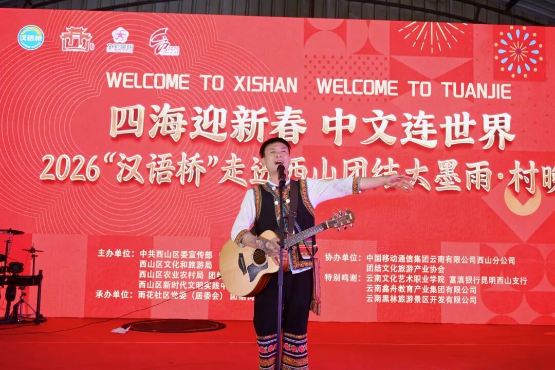 村民们以极具乡土特色的节目《美丽团结欢迎你》代表昆明市西山区团结社区欢迎各方宾客。俄罗斯选手梅丽莎、越南选手阮氏红绒、马达加斯加选手范云捷、泰国选手杨金玉轮番献唱,不同语言的歌声里,传递着同样真挚的祝福。