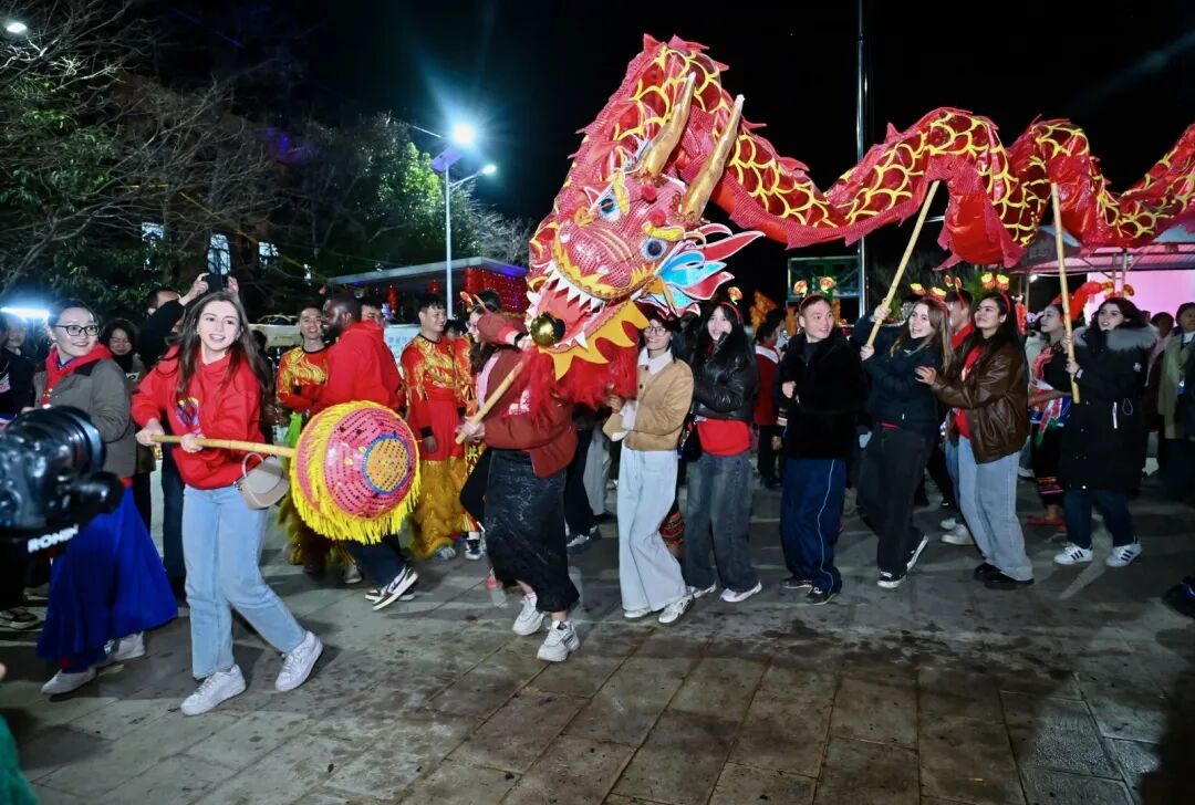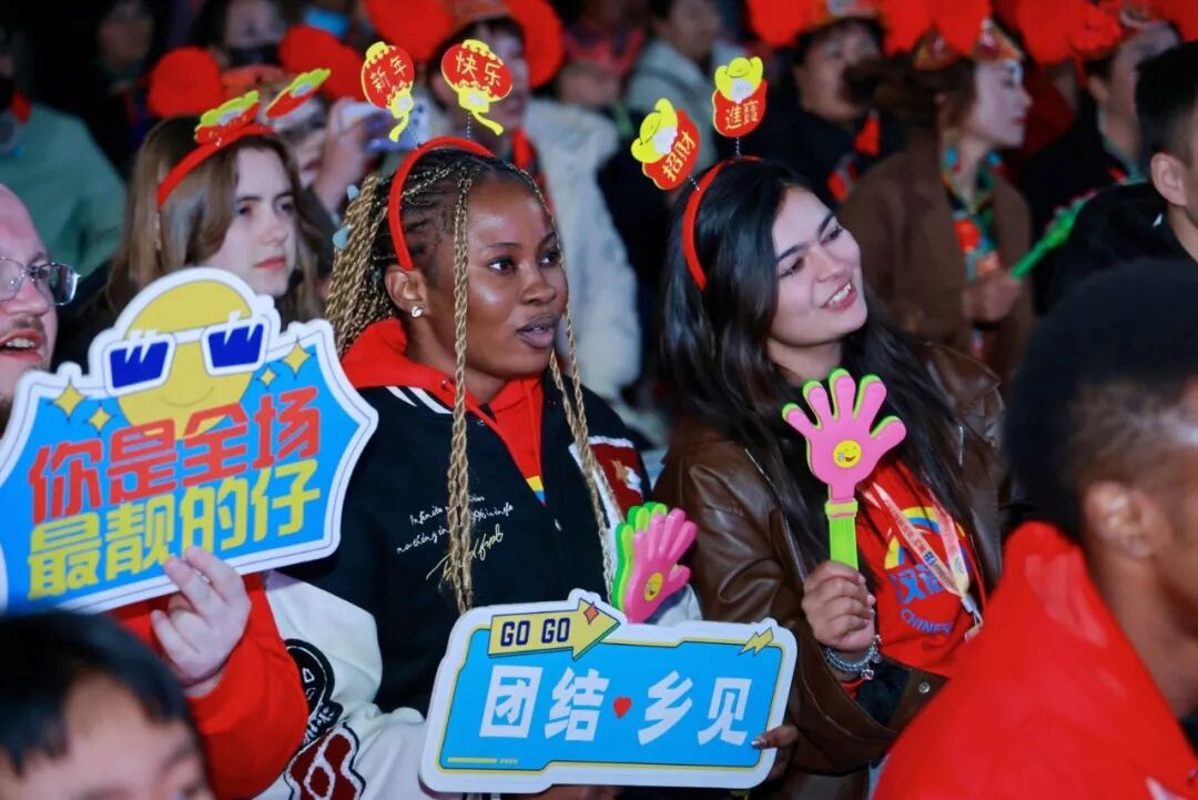 互动环节更是将氛围推向高潮。“学说民族话”妙趣横生,“抱团取暖”游戏让中外友人快速破冰,“猜灯谜”则联动日间游园活动,深化文化体验。