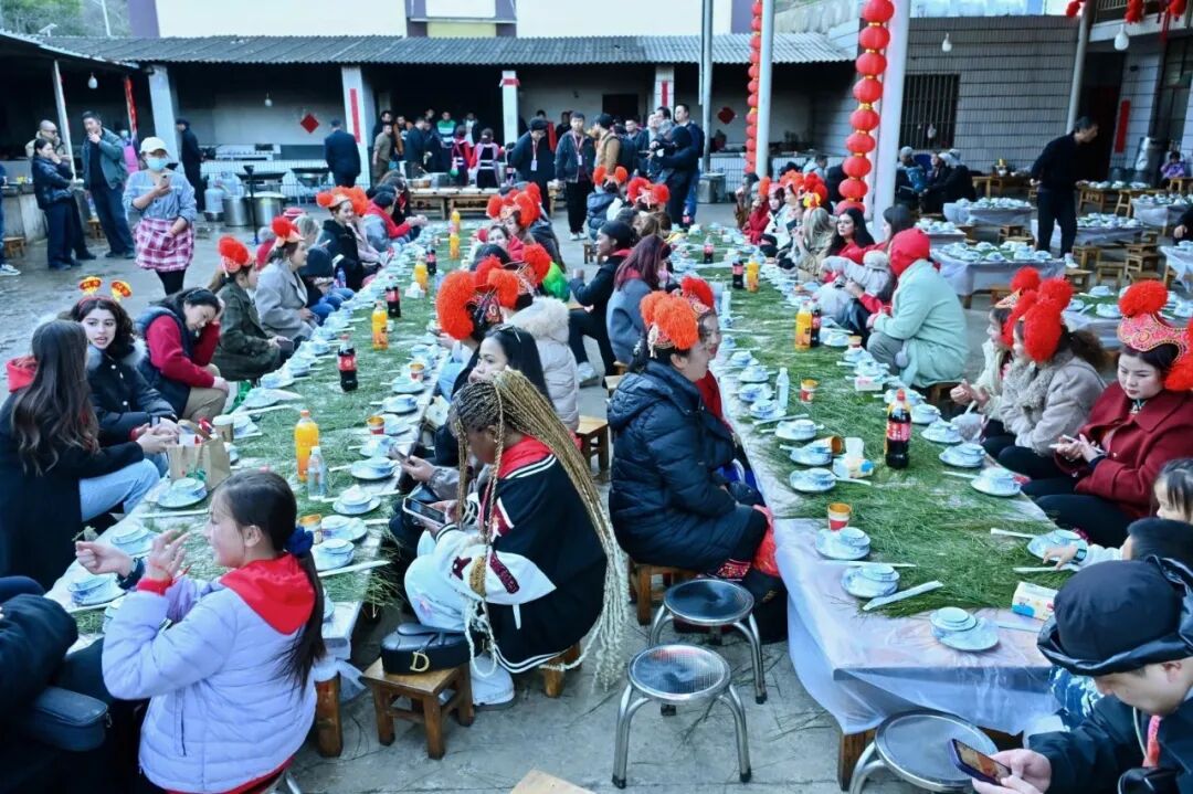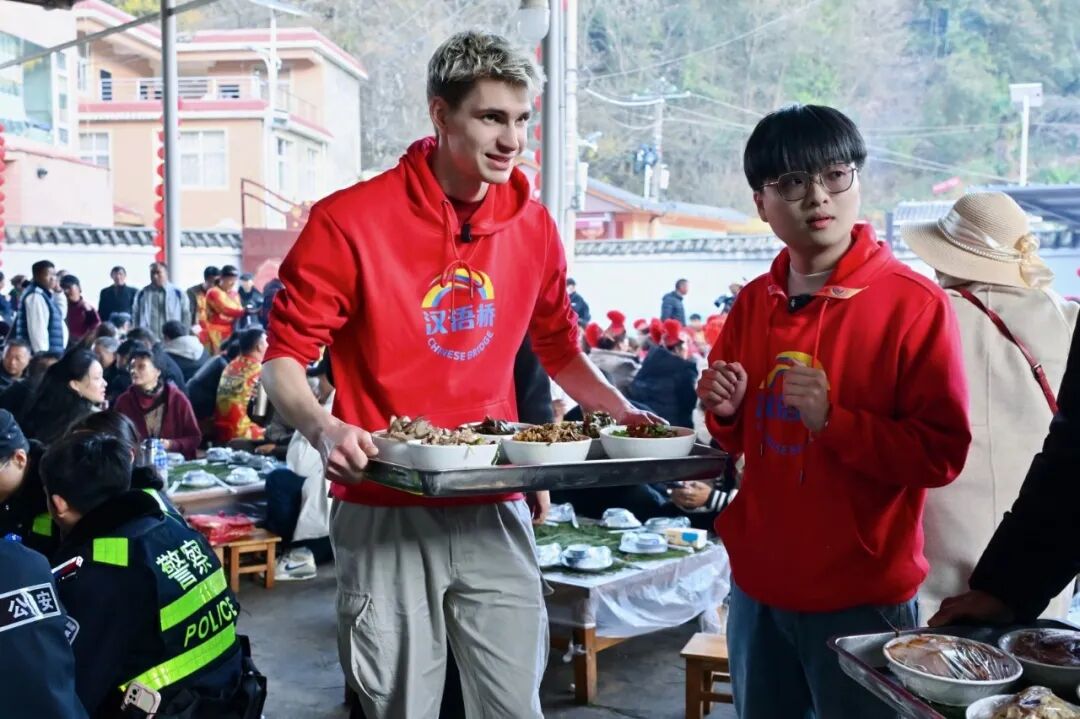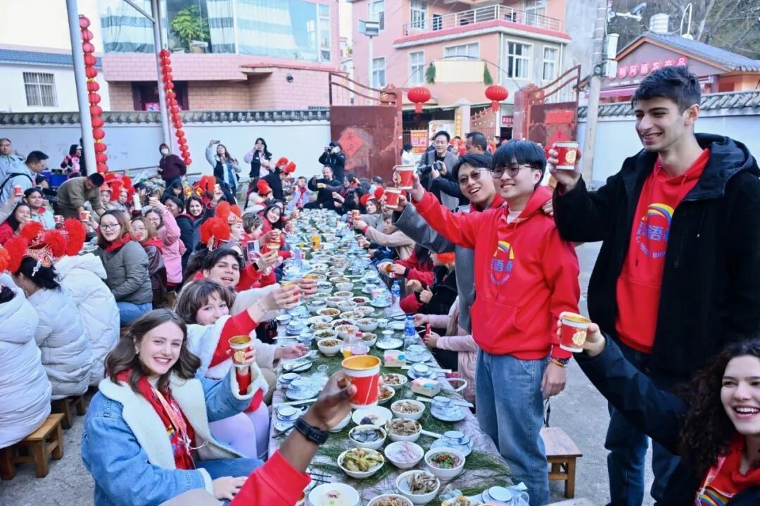 “汉语桥”选手们与村民围坐长桌,品尝地道云南乡村菜肴,中外友人互相介绍家乡的年味,与当地村民围坐畅谈,语言的隔阂被笑容与热情消融,尽显“和睦、和乐、和美”的温情。碗筷之间,流淌的是对“团圆”的共同向往。