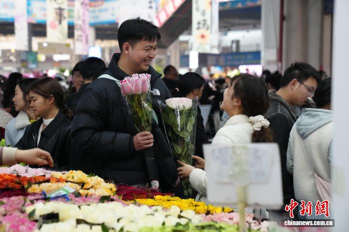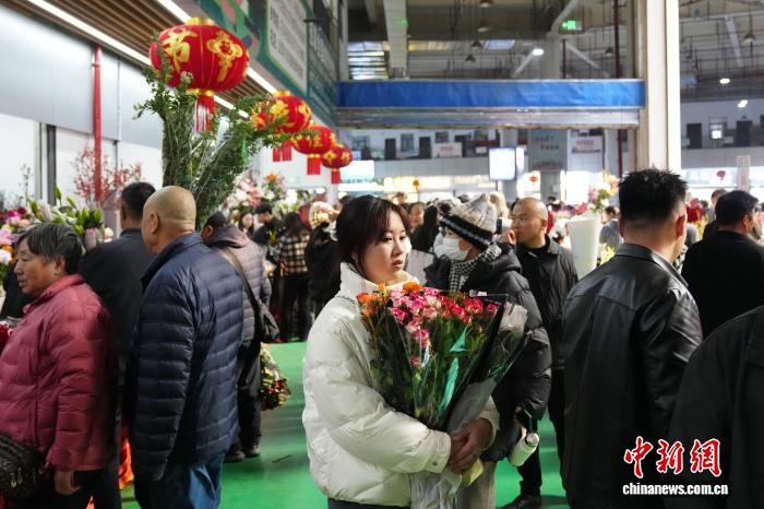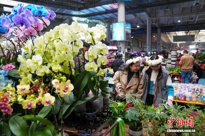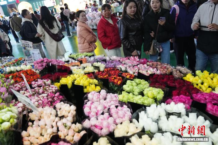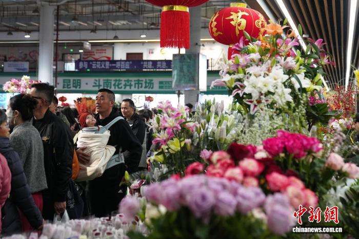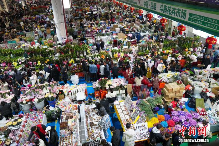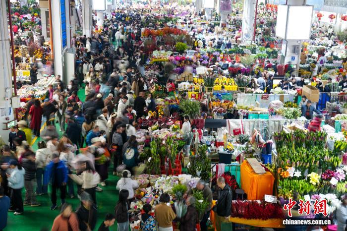 2月8日,春节临近,周末的昆明斗南花卉市场热闹非凡,众多市民和游客到此选购鲜花,感受专属昆明的花式浪漫。中新社记者 刘冉阳摄