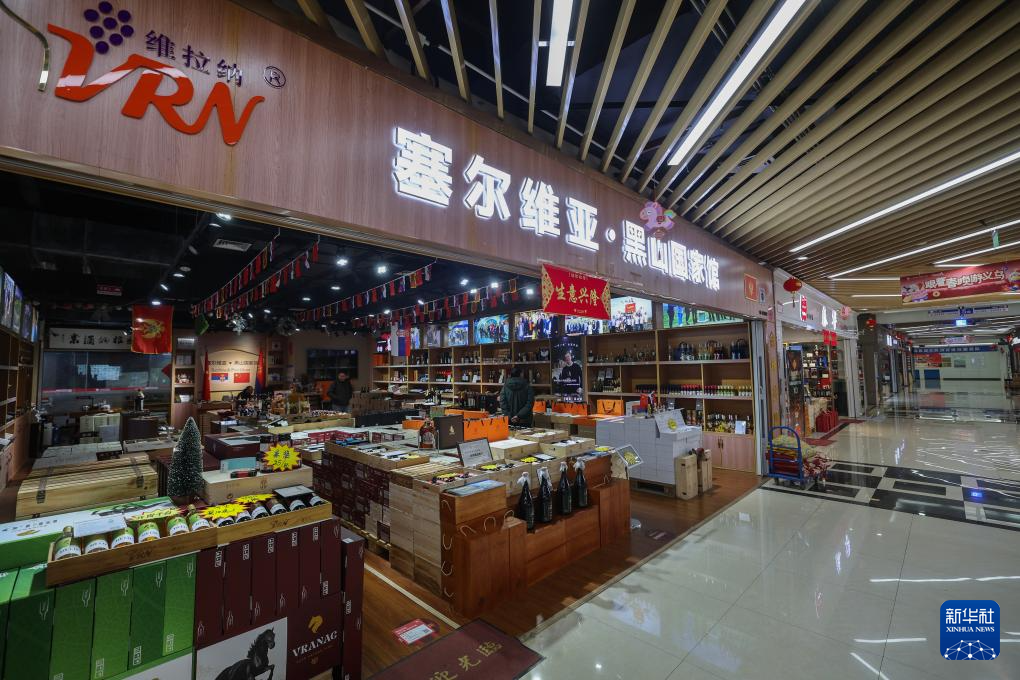 1月30日,在义乌中国进口商品城一家店铺内,店员给顾客推荐塞尔维亚葡萄酒。