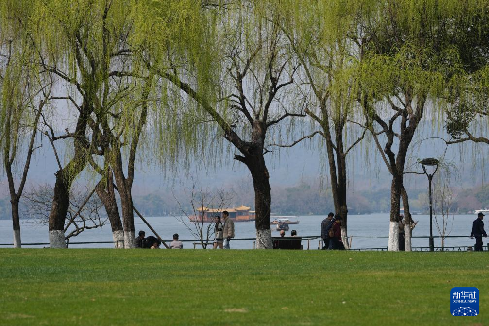 3月11日,游客在西湖边漫步游览,柳枝已抽出嫩芽。
