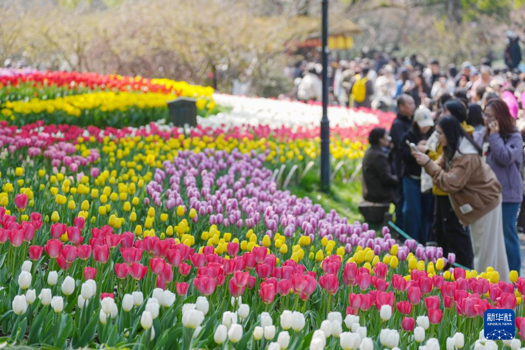 3月11日,游客在西湖景区太子湾公园观赏盛开的郁金香。