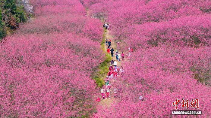 3月7日,杭州临安玲珑街道米积村,游客漫步樱花海享受春日风光。杨益灵 摄